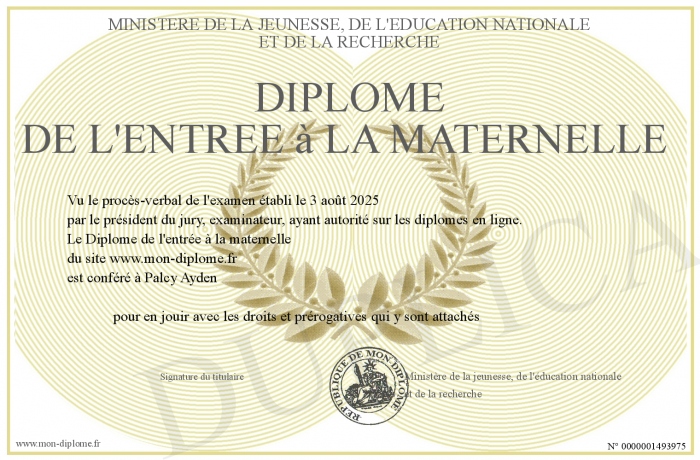 Envoyez par email votre Diplôme de l'entrée à la maternelle personalisé