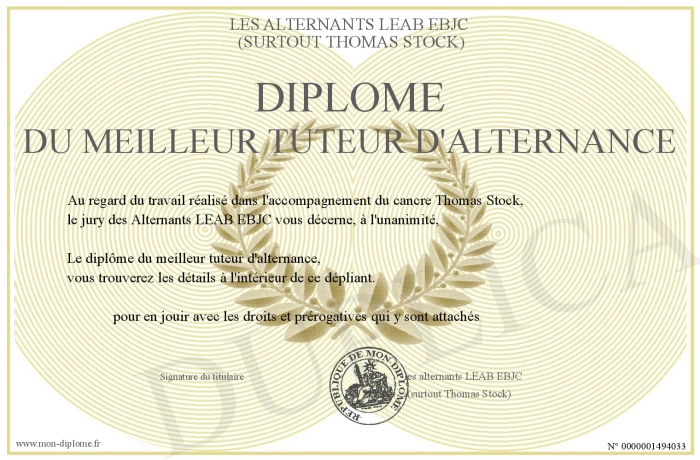 Envoyez par email votre Diplôme du meilleur tuteur d'alternance personalisé