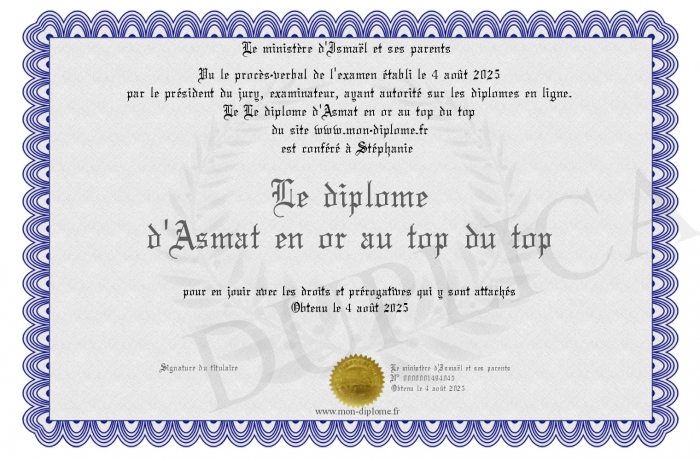 Envoyez par email votre Le diplôme d'Asmat en or au top du top personalisé