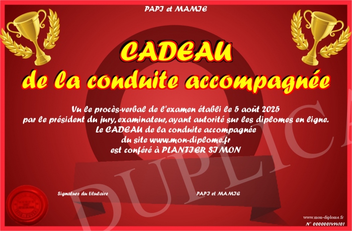 Envoyez par email votre CADEAU de la conduite accompagnée personalisé