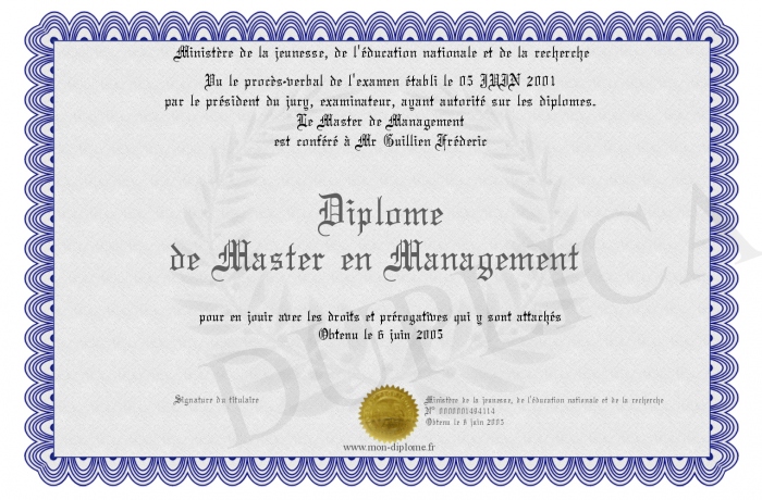 Envoyez par email votre Diplôme de Master en Management personalisé