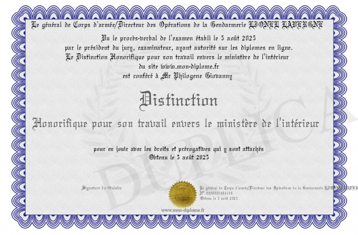 Envoyez par email votre Distinction Honorifique pour son travail envers le ministère de l'intérieur personalisé