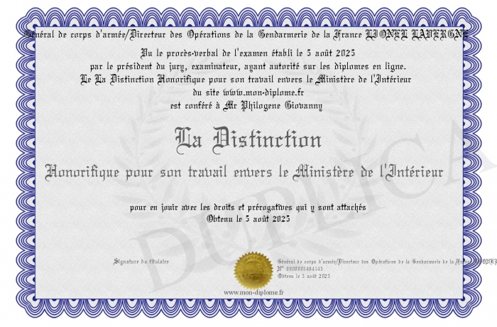 Envoyez par email votre La Distinction Honorifique pour son travail envers le Ministère de l'Intérieur personalisé