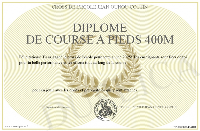 Envoyez par email votre Diplôme de course a pieds 400m personalisé