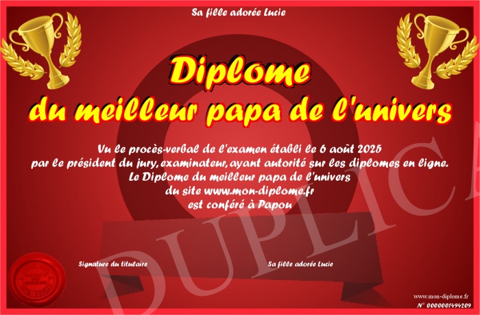 Envoyez par email votre Diplôme du meilleur papa de l'univers personalisé