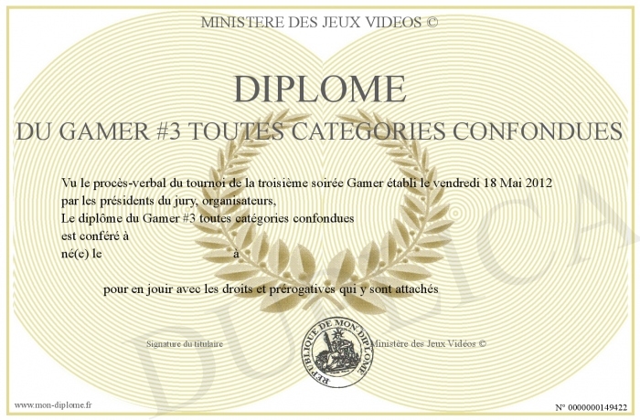 Envoyez par email votre Diplôme du Gamer #3 toutes catégories confondues personalisé