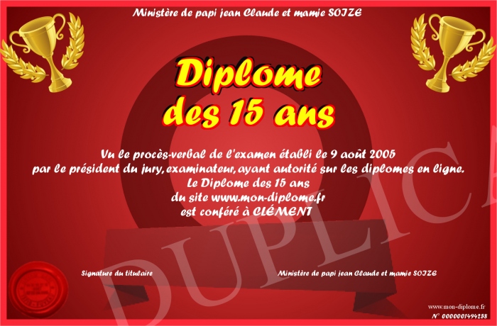 Envoyez par email votre Diplôme des 15 ans personalisé
