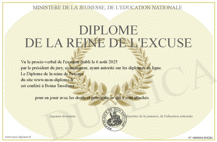 Envoyez par email votre Diplôme de la reine de l'excuse personalisé