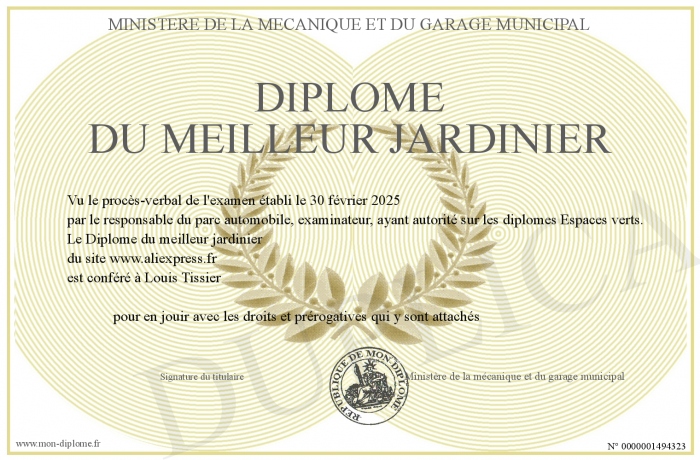 Envoyez par email votre Diplôme du meilleur jardinier personalisé