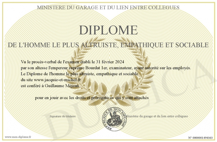 Envoyez par email votre Diplôme de l'homme le plus altruiste, empathique et sociable personalisé