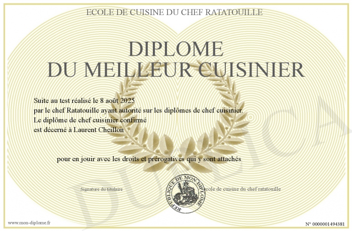 Envoyez par email votre Diplôme du meilleur cuisinier personalisé
