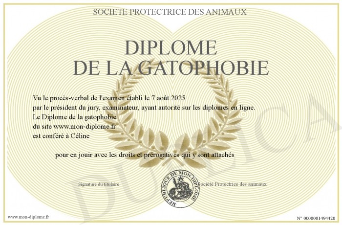 Envoyez par email votre Diplôme de la gatophobie personalisé