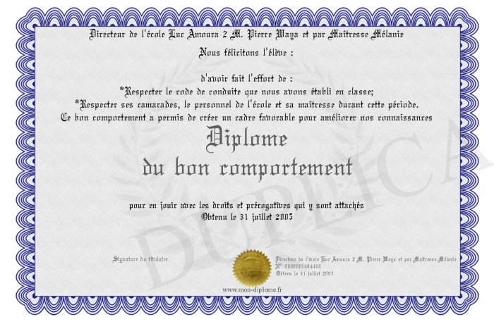 Envoyez par email votre Diplôme du bon comportement personalisé