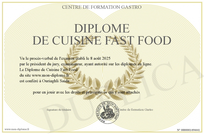 Envoyez par email votre Diplôme de Cuisine Fast Food personalisé