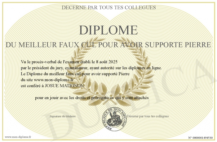 Envoyez par email votre Diplôme du meilleur faux cul pour avoir supporté Pierre personalisé