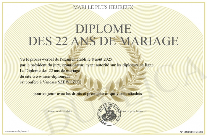 Envoyez par email votre Diplôme des 22 ans de mariage personalisé