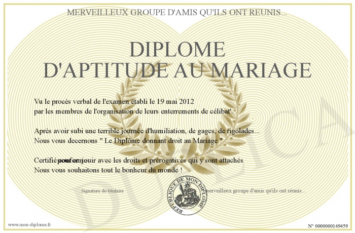 Envoyez par email votre Diplôme d'aptitude au mariage personalisé
