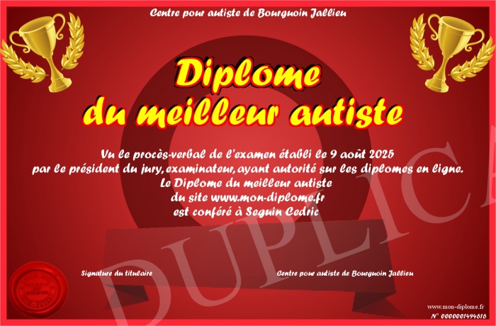 Envoyez par email votre Diplôme du meilleur autiste personalisé