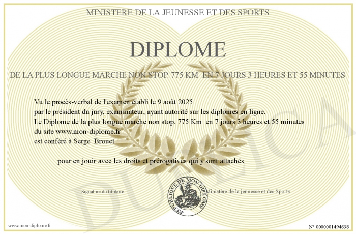 Envoyez par email votre Diplôme de la plus longue marche non stop. 775 Km en 7 jours 3 heures et 55 minutes personalisé