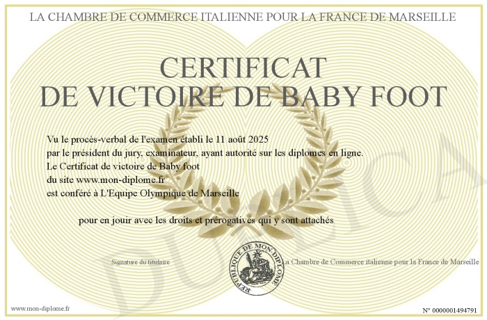 Envoyez par email votre Certificat de victoire de Baby foot personalisé