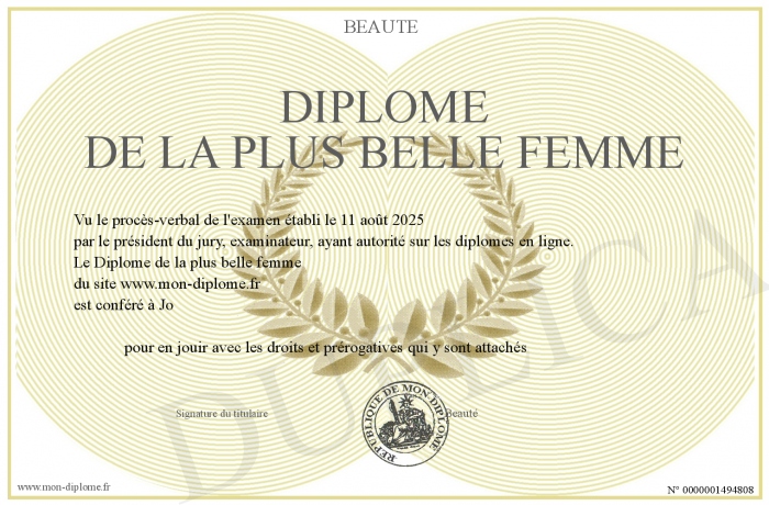 Envoyez par email votre Diplôme de la plus belle femme personalisé