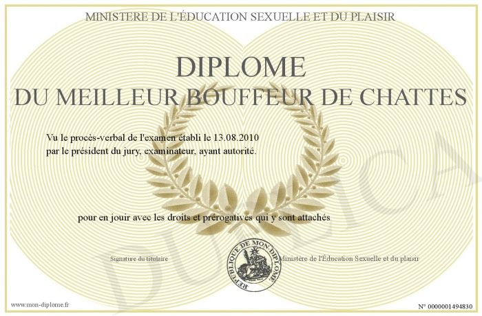 Envoyez par email votre Diplôme du meilleur bouffeur de chattes personalisé