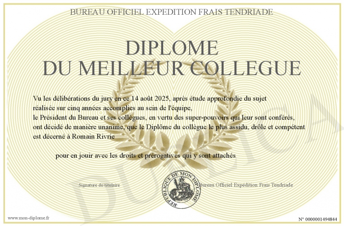 Envoyez par email votre Diplôme du Meilleur Collègue personalisé