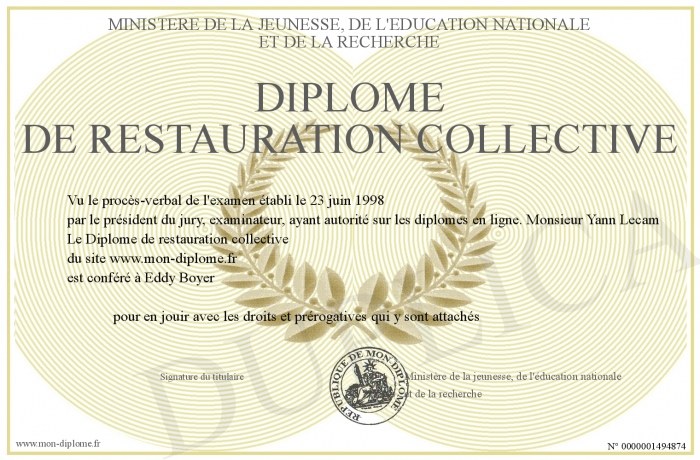 Envoyez par email votre Diplôme de restauration collective personalisé