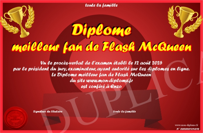 Envoyez par email votre Diplôme meilleur fan de Flash McQueen personalisé