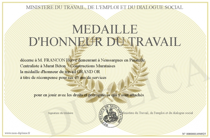 Envoyez par email votre MEDAILLE D'HONNEUR DU TRAVAIL personalisé