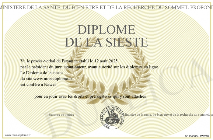Envoyez par email votre Diplôme de la sieste personalisé