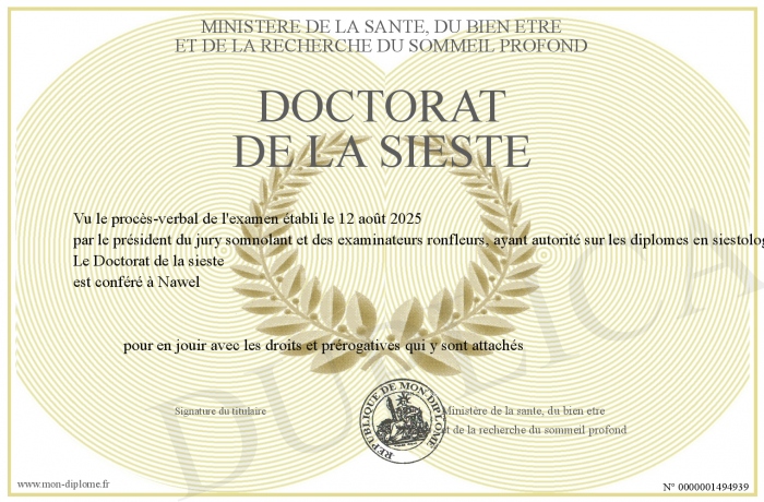 Envoyez par email votre Doctorat de la sieste personalisé