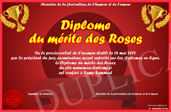 Envoyez par email votre Diplôme du mérite des Roses personalisé