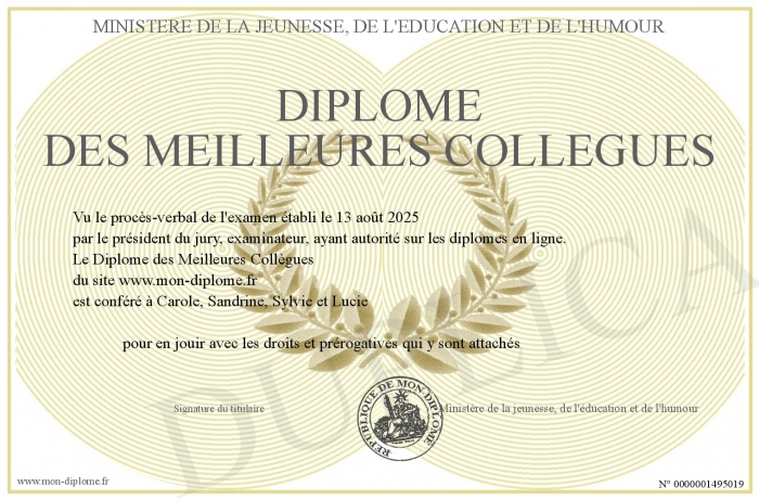 Envoyez par email votre Diplôme des Meilleures Collègues personalisé