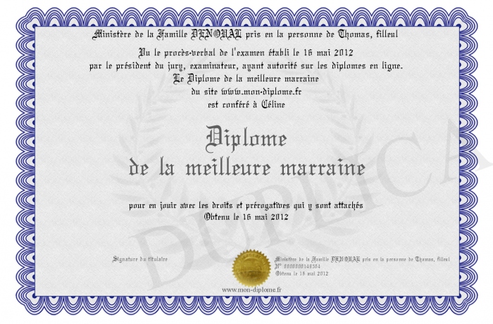 Envoyez par email votre Diplôme de la meilleure marraine personalisé