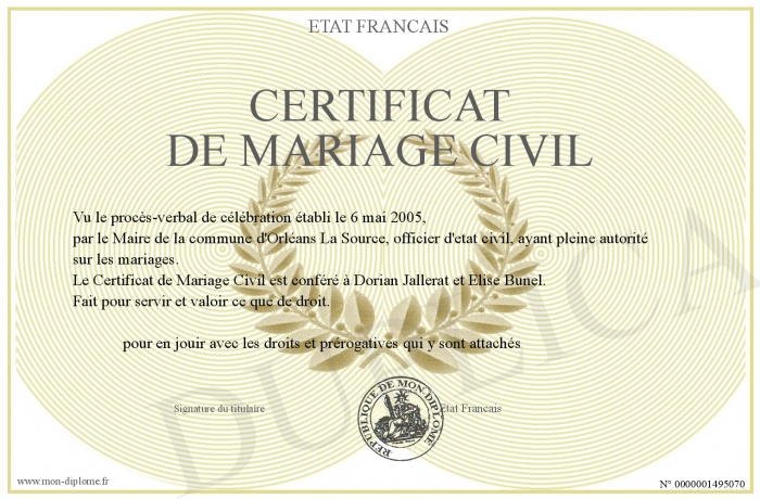 Envoyez par email votre Certificat de Mariage Civil personalisé