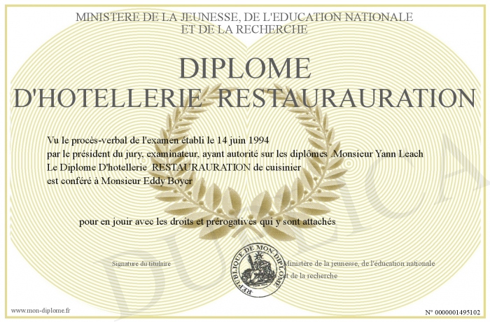 Envoyez par email votre Diplôme D'hôtellerie RESTAURAURATION personalisé