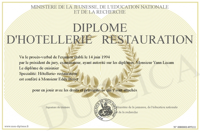 Envoyez par email votre Diplôme d'hôtellerie restauration personalisé