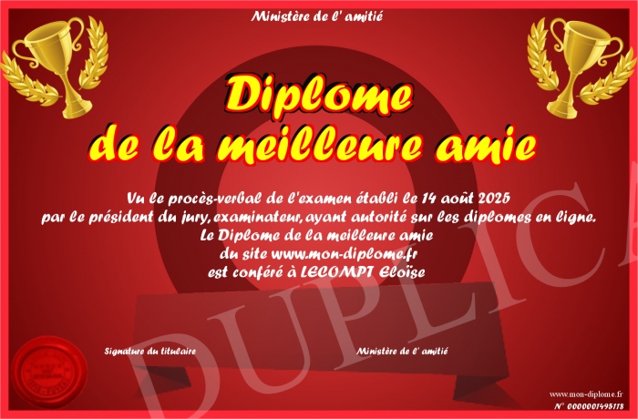Envoyez par email votre Diplôme de la meilleure amie personalisé