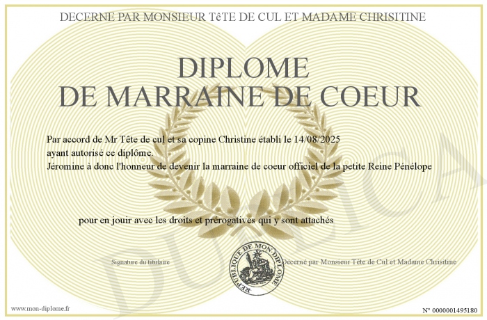 Envoyez par email votre Diplôme de Marraine de Coeur personalisé