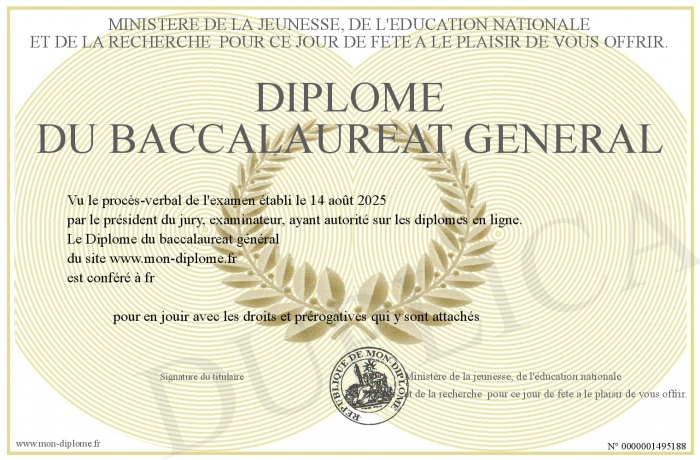 Envoyez par email votre Diplôme du baccalaureat général personalisé