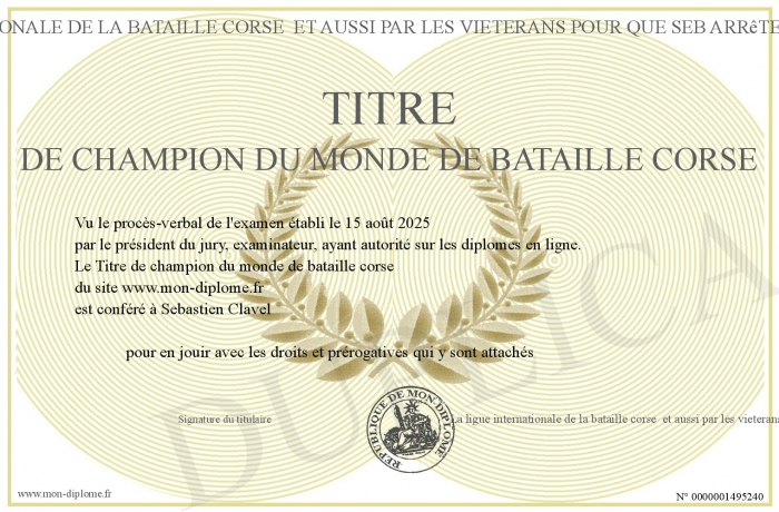 Envoyez par email votre Titre de champion du monde de bataille corse personalisé