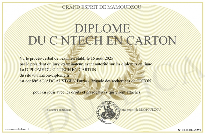 Envoyez par email votre DIPLOME DU C NTECH EN CARTON personalisé