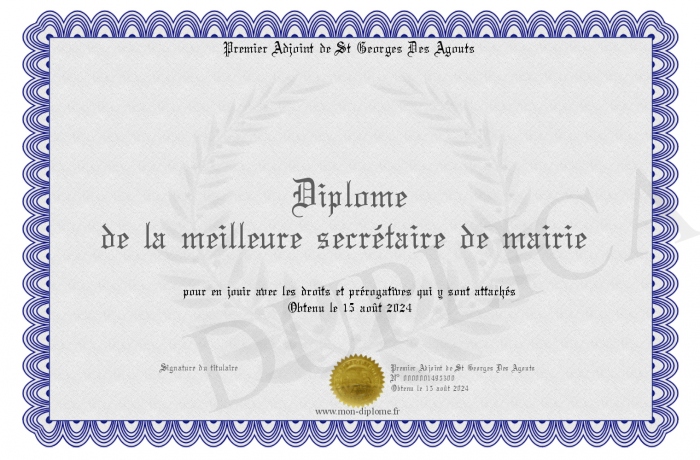 Envoyez par email votre Diplôme de la meilleure secrétaire de mairie personalisé