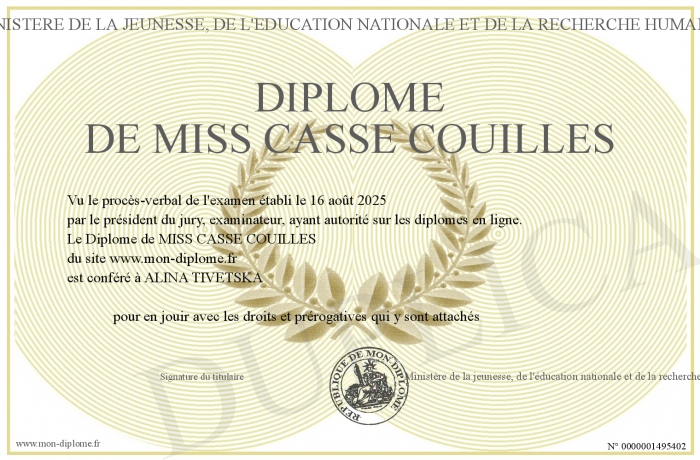 Envoyez par email votre Diplôme de MISS CASSE COUILLES personalisé