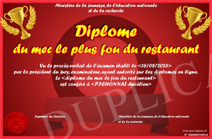 Envoyez par email votre Diplôme du mec le plus fou du restaurant personalisé