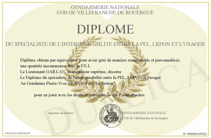 Envoyez par email votre Diplôme du spécialiste de l'interopérabilité entre la PEL, LRPGN et l'usager personalisé