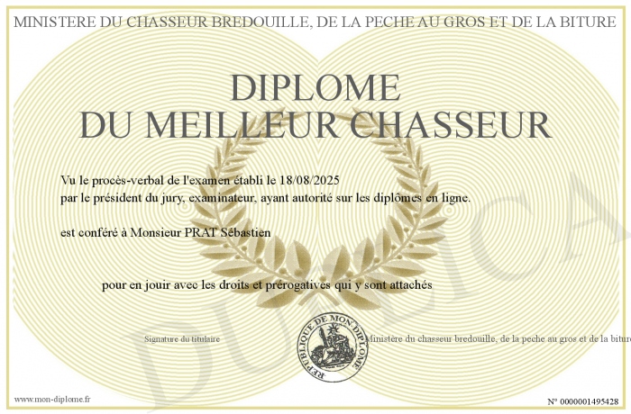 Envoyez par email votre Diplôme du meilleur chasseur personalisé