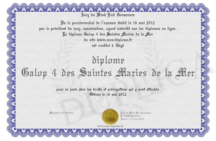 Envoyez par email votre diplôme Galop 4 des Saintes Maries de la Mer personalisé