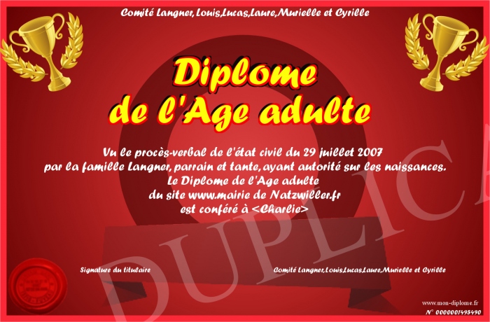 Envoyez par email votre Diplôme de l'Age adulte personalisé